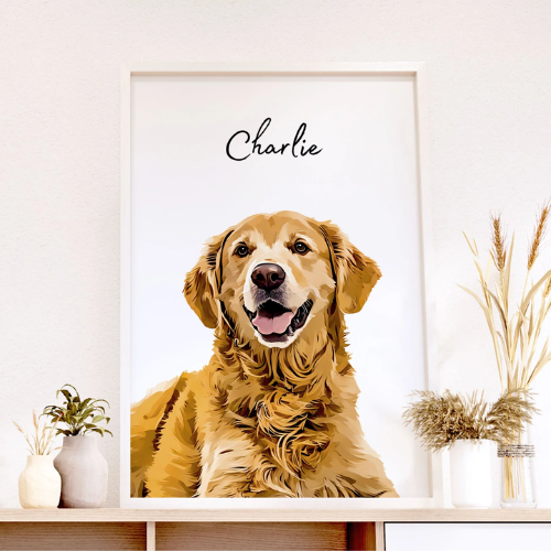 This Custom Pet Portrait (Pet Photo + Name) is a personalized artwork created just for your furry friend using a photo of your pet. It's just as easy as you can upload a picture of your dog, cat, or other companion. The artists turn it into a stylish portrait that includes your pet’s name, making it look beautiful on your wall or as a gift for someone who loves animals.